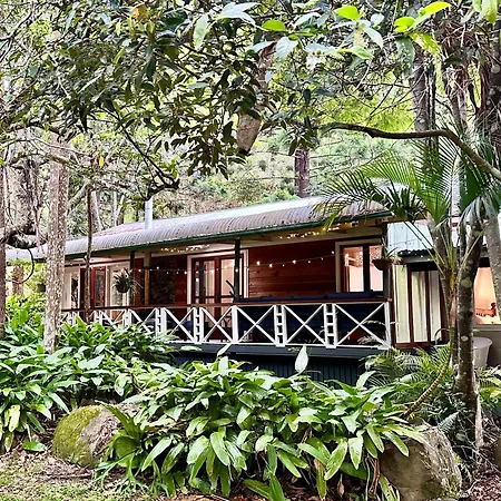 Cette villa Creekside Rainforest Retreat propose une cuisine équipée avec une bouilloire électrique, un réfrigérateur et de la vaisselle à l'usage des clients.